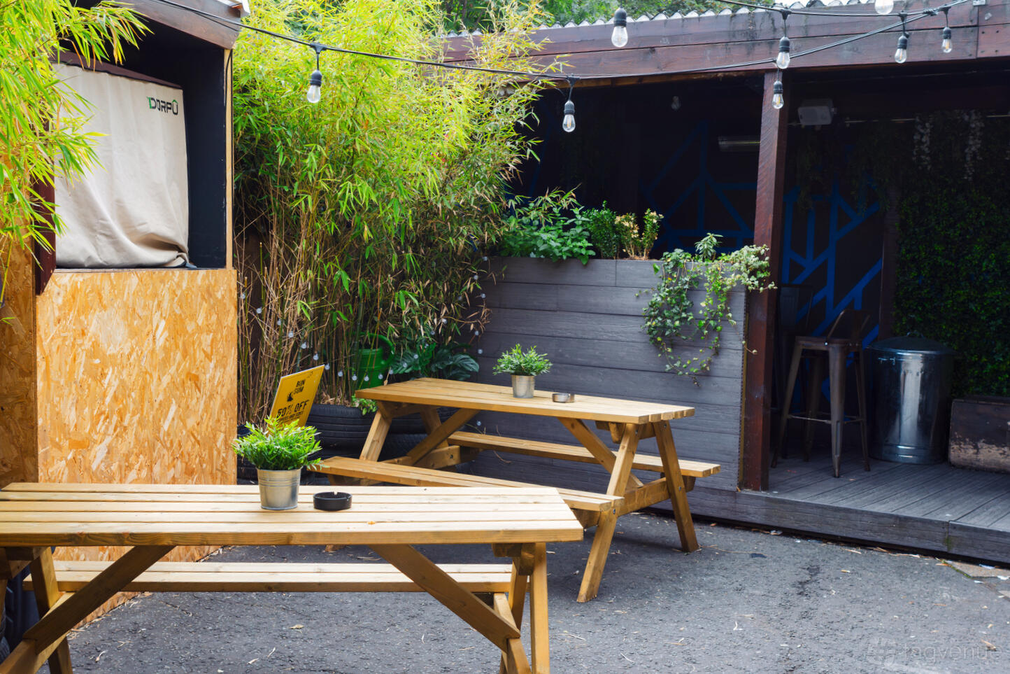 It features a variety of seating options, from cozy benches to tall tables, accommodating both large groups and small parties. Overhead string lights or lanterns create a warm, festive ambiance as the evening goes on.