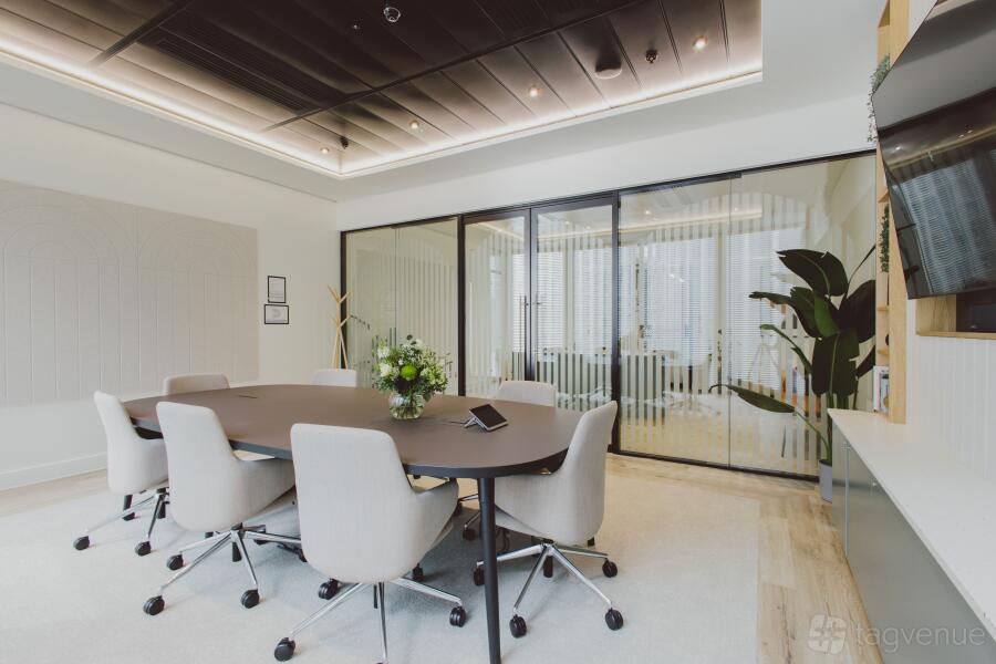 The long wooden table at the center of the room beckons guests to gather around and engage in conversations. A large flat-screen TV hangs on the front wall, ready for presentations, video conferences, or data sharing.