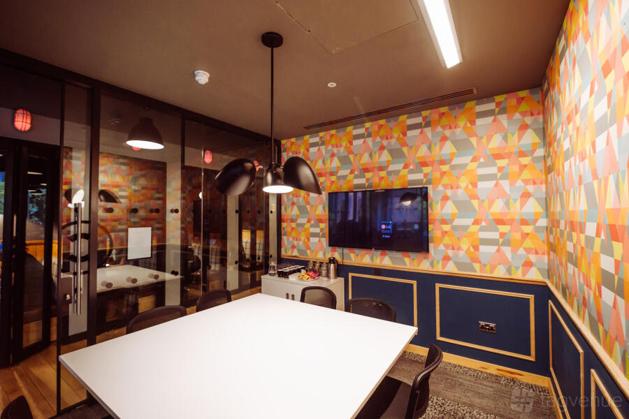 The Newton Meeting Room at Citibase Holborn is a vibrant space designed to foster creativity and productivity. It features a large wooden table with comfortable seating, complemented by a patterned carpet. The walls are adorned with bold geometric designs in various colors, creating an atmosphere that inspires innovation and lively discussions.