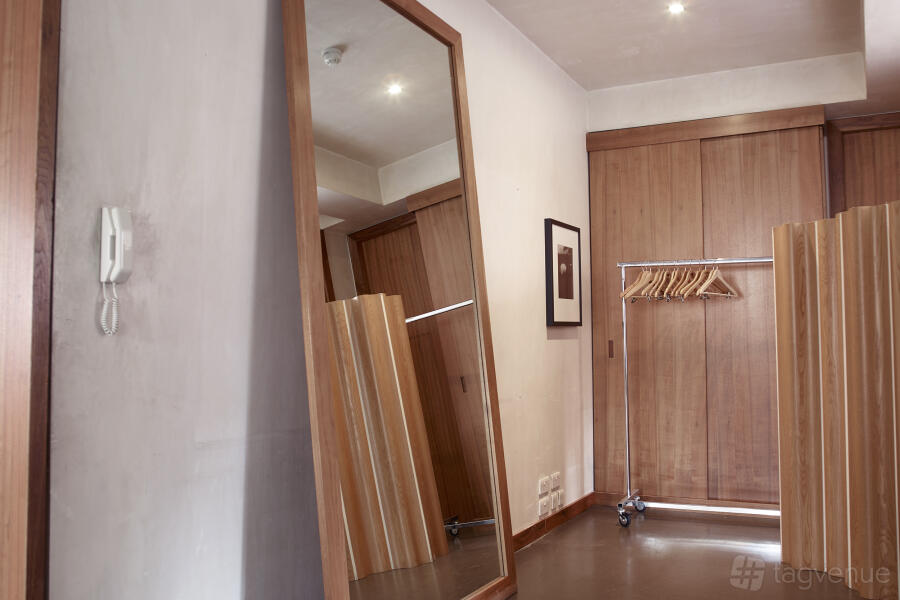 50 sqm film and photographic studio with an apartment/lifestyle feel, capable of accommodating up to 12 people. Designed in a mid-century modern style by renowned architect Spencer Fung, featuring concrete floors and work surfaces, walnut sliding doors, and natural plaster walls.