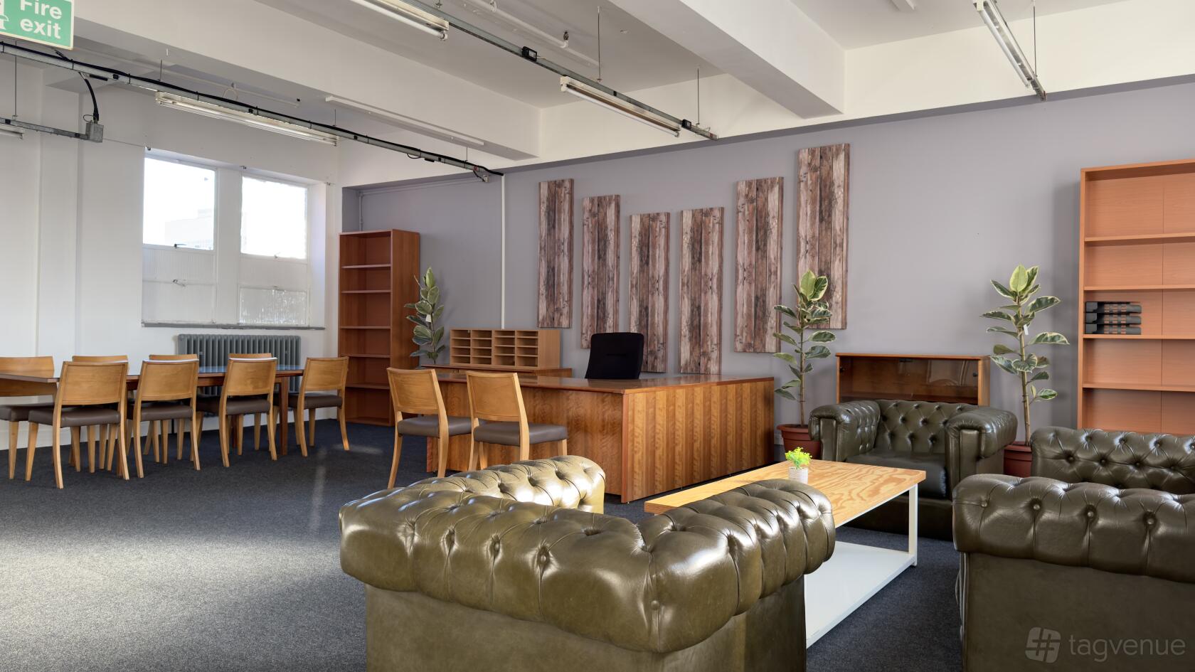 The room includes a large executive table with comfortable chairs for formal meetings and a cozy seating area with plush leather sofas for more casual conversations. Equipped with a 55-60 inch flat-screen TV for screen-sharing, a flipchart, and a whiteboard, this room has everything needed for productive sessions.