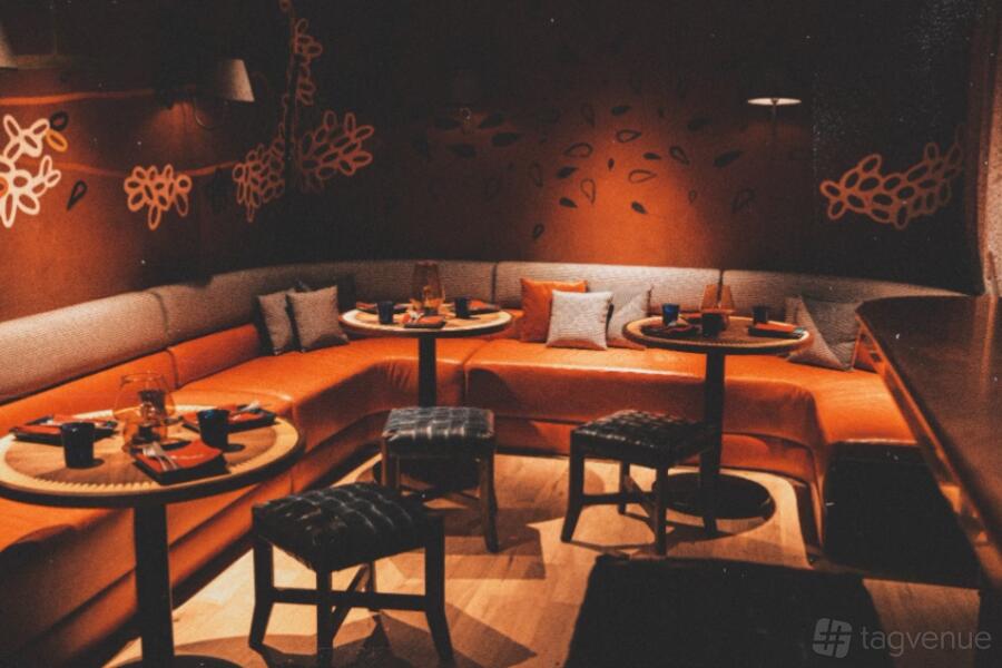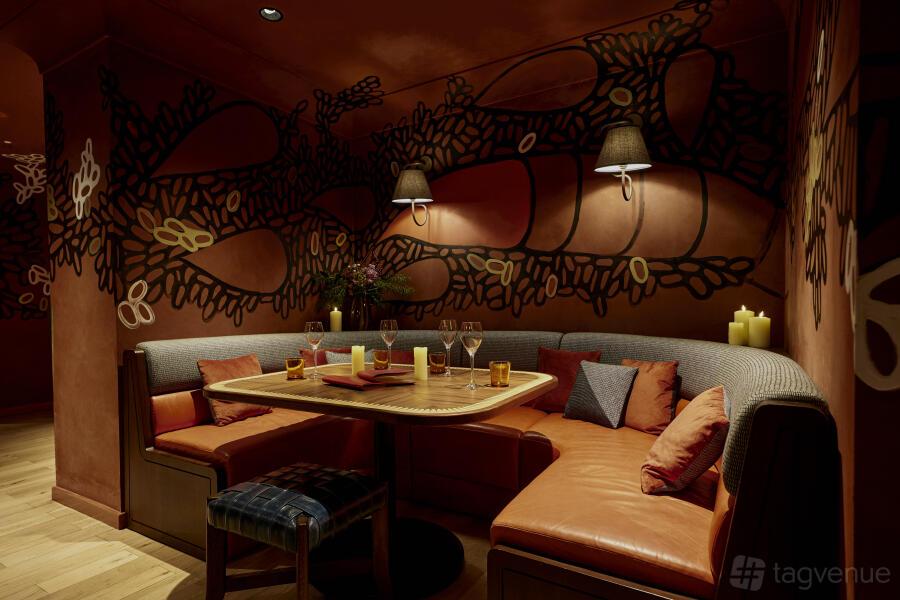 The Clandesti Bar is a hidden gem at the heart of the restaurant, featuring its own independent entrance. This intimate area, adorned with earthy tones and artwork painted directly onto the walls, has a square layout with the bar at its center. It offers seating for up to 30 guests, with 15 bar stools, and can accommodate up to 70 standing guests.