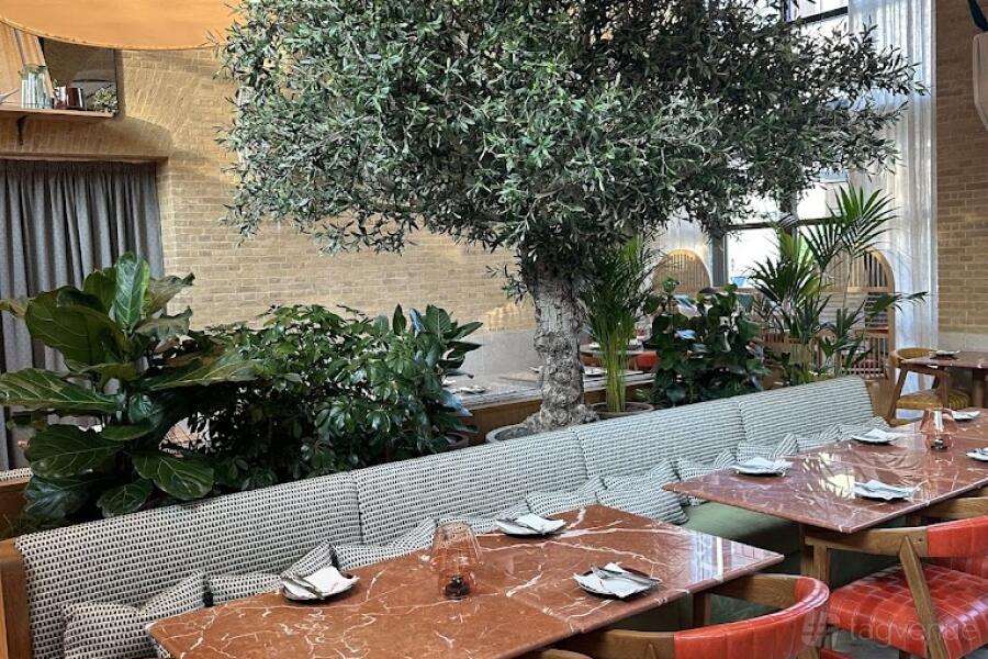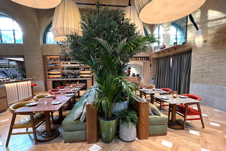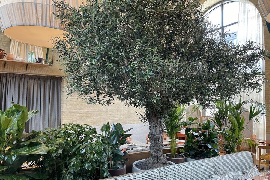 The Olive Tree section, also to the left of the central island, is dominated by an ancient olive tree and offers views of the Josper kitchen. It provides seating for an additional 30 guests.