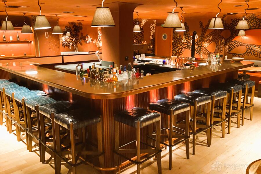 The Main Restaurant is situated to the left of the central island, where the bar and display cabinet are located, framed by large lights that create a Mediterranean atmosphere. This space can comfortably seat up to 70 guests.