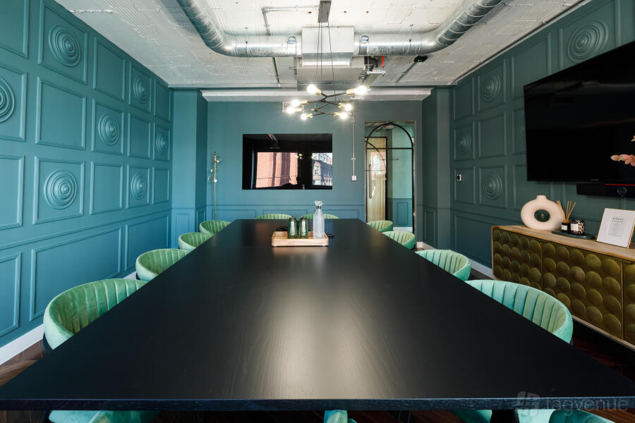 Meeting room 1 has been designed with a calming aesthetic that combines functionality and elegance. It is equipped with state-of-the-art audiovisual technology, including a high-resolution camera and a large TV screen for presentations. To enhance collaboration, there is a whiteboard mounted on the wall, providing a space for brainstorming and visual presentations.