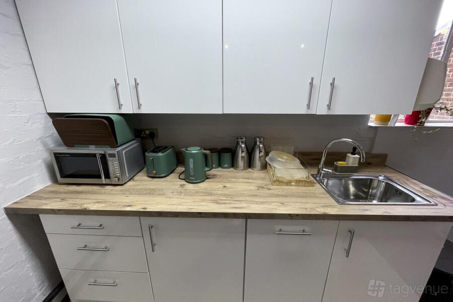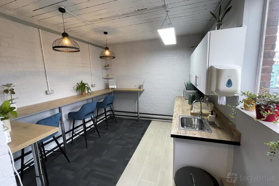 The space includes a well-stocked refreshment station with coffee, tea, and water. Its polished wooden floors, industrial ceiling details, minimalistic decor, and stylish shelving and plants add a touch of elegance to the practical elements of the large whiteboard and LED lighting.