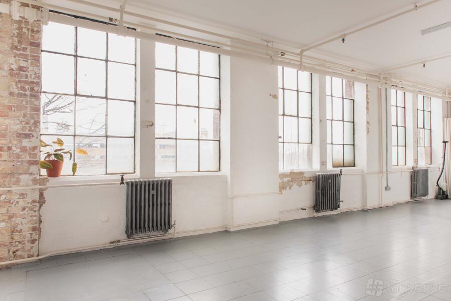 Studio 1 at Sunset Studios offers around 2000 square feet of adaptable industrial space, designed to meet the needs of both small and large productions. Lined with expansive North and South-facing windows, the studio is flooded with natural light throughout the day. Its open layout is perfect for larger teams and those wanting to shoot with multiple sets. The studio is equipped with useful features such as a kitchenette, an en-suite shower room and access to 3-phase power. Located adjacent to Studio 3, both studios can be hired together for an even larger working space