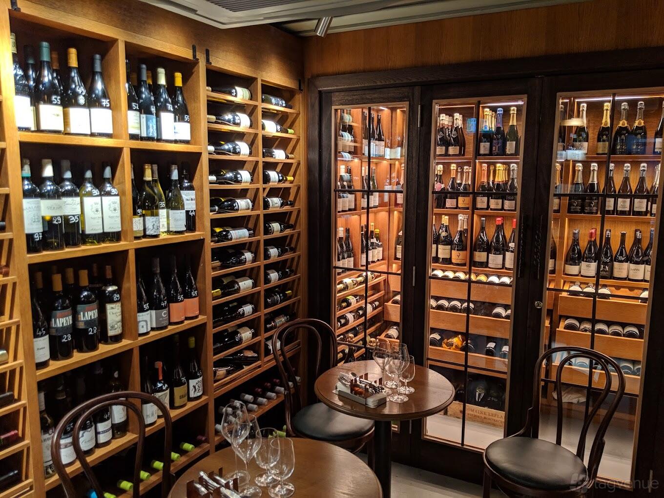 Surrounded by floor-to-ceiling wine displays showcasing an extensive collection, it offers a cozy atmosphere perfect for private tastings, small gatherings, or wine events. Warm lighting and comfortable seating enhance the elegant ambiance, making it a unique destination for wine enthusiasts.