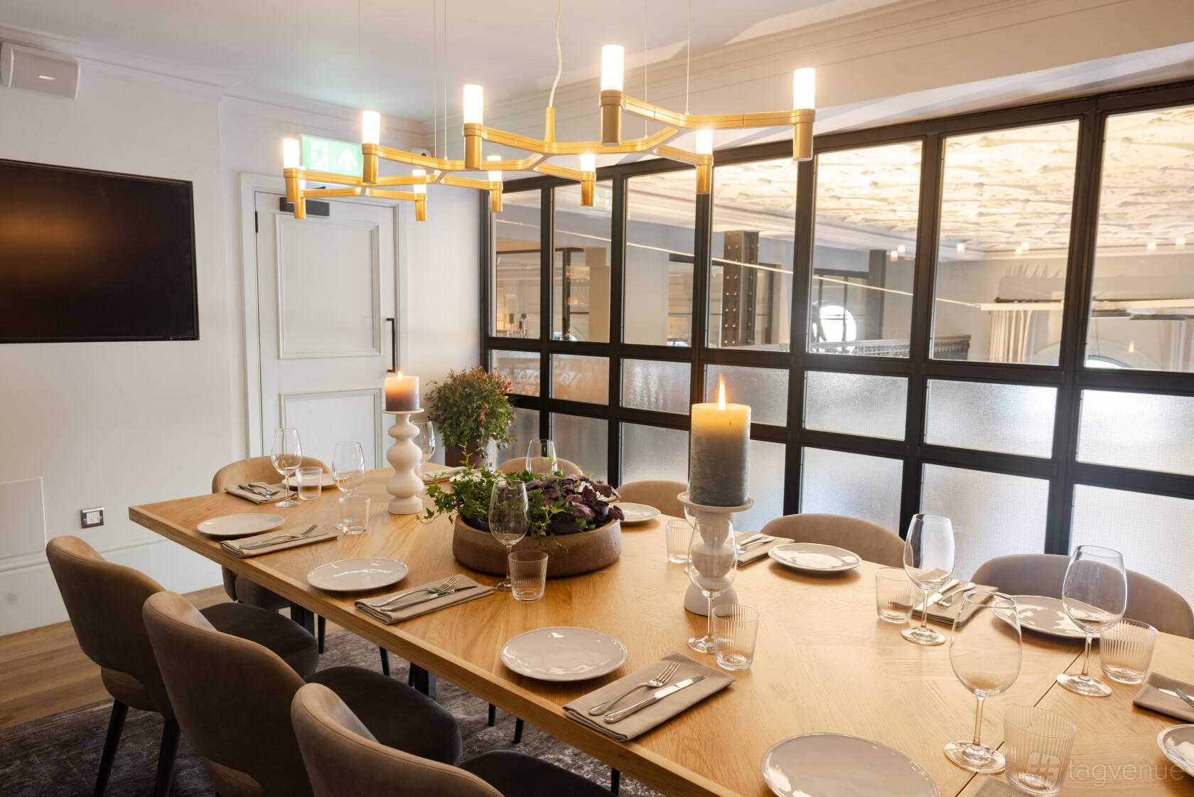 The Gallery features floor-to-ceiling windows for natural light, complemented by hanging lights, candles, and plants. A wall-embedded screen is available for presentations. Tiered set menus designed for sharing make it perfect for communal dining. The space is only available for seated dining due to its layout.