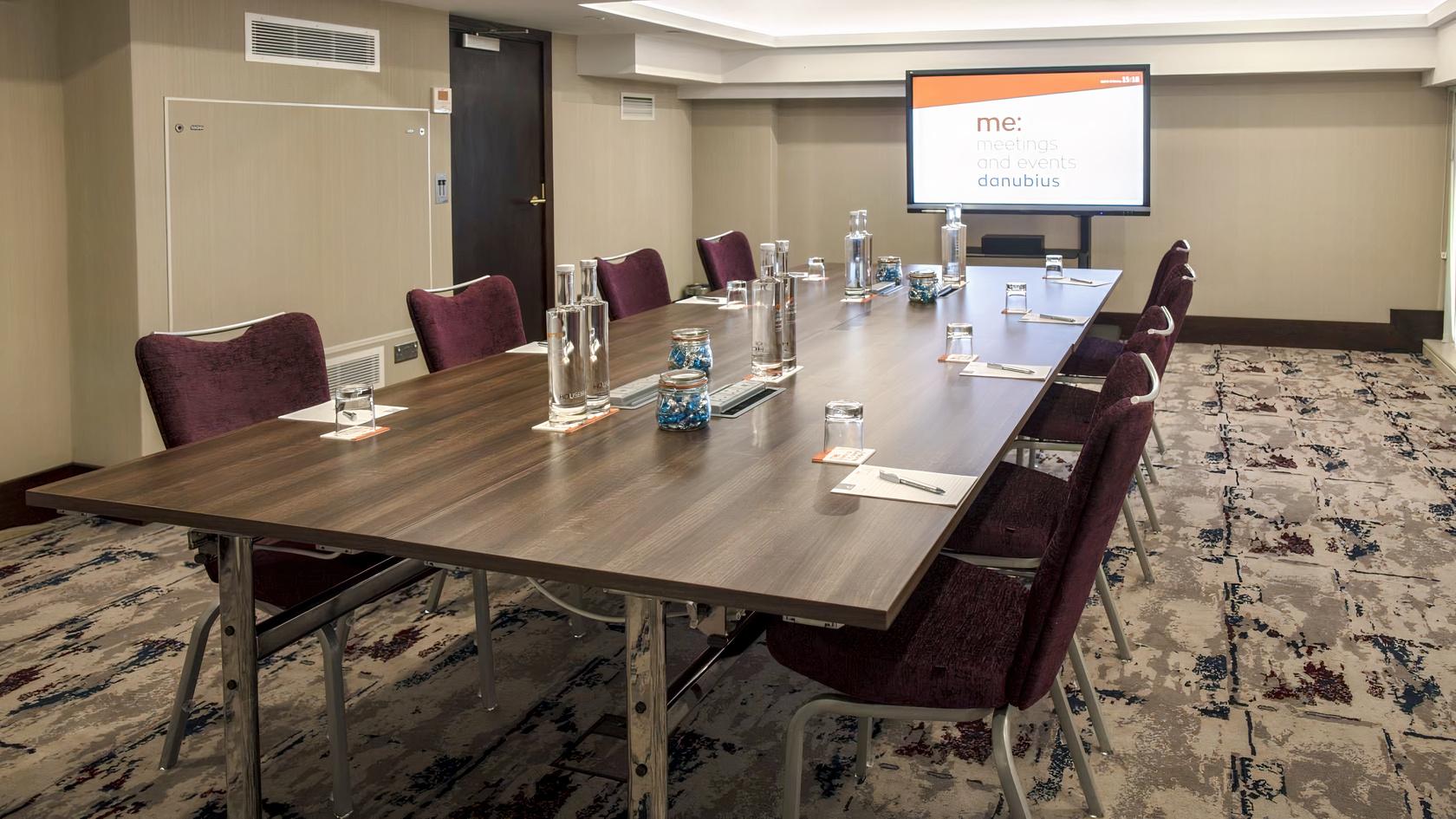 It accommodates up to 30 people in theatre style and 16 for boardroom meetings, making it suitable for any small group setup. It also includes a natural light facility, air conditioning, and a TV, which adds to the functionality of the room for any business need.