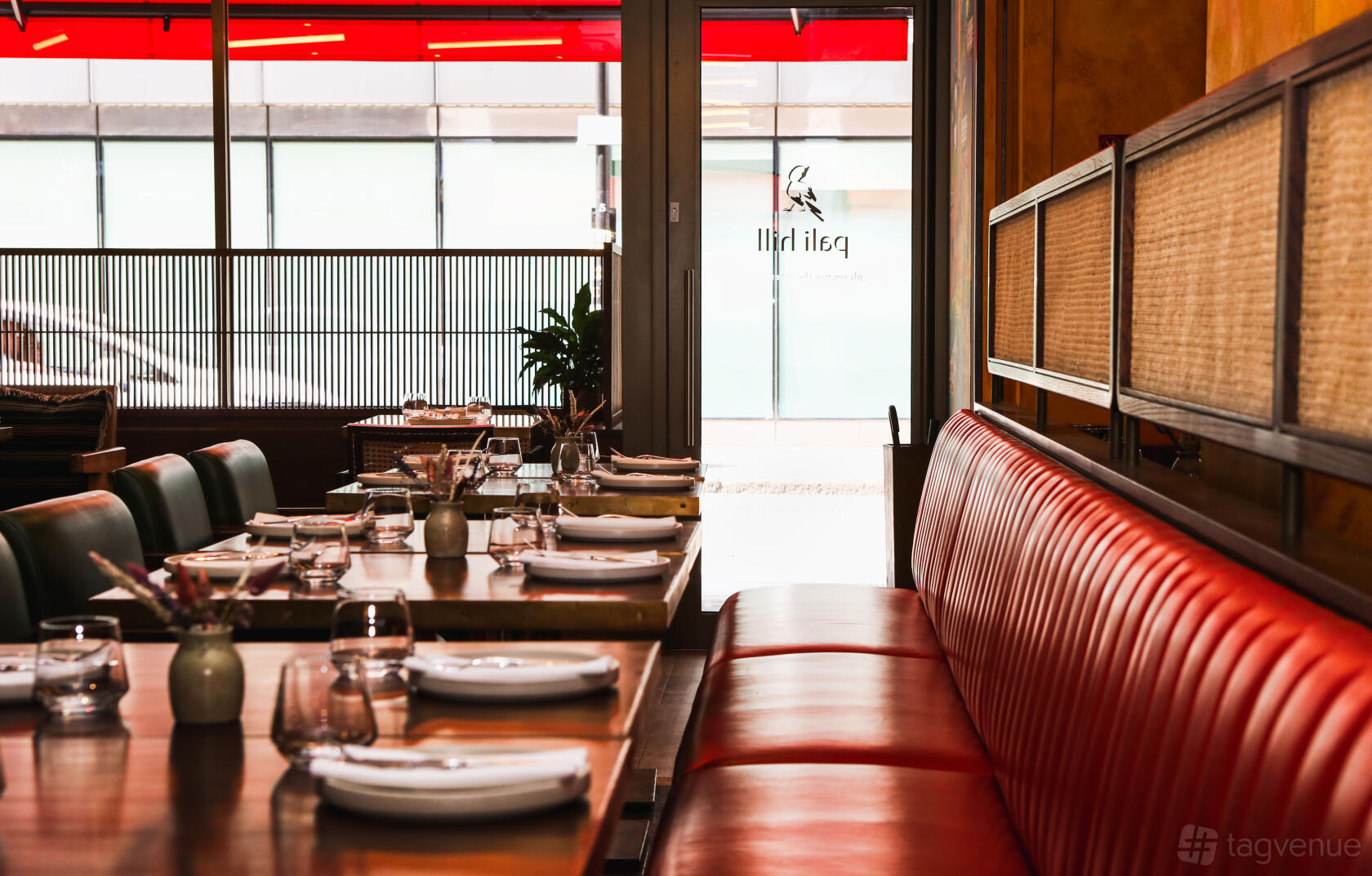 Pahli Hill dining area is vibrant yet informal, with modern prints adding splashes of colour to the walls, an open kitchen in one corner, and a brass-grid bar that serves beverages inspired by Indian classics.