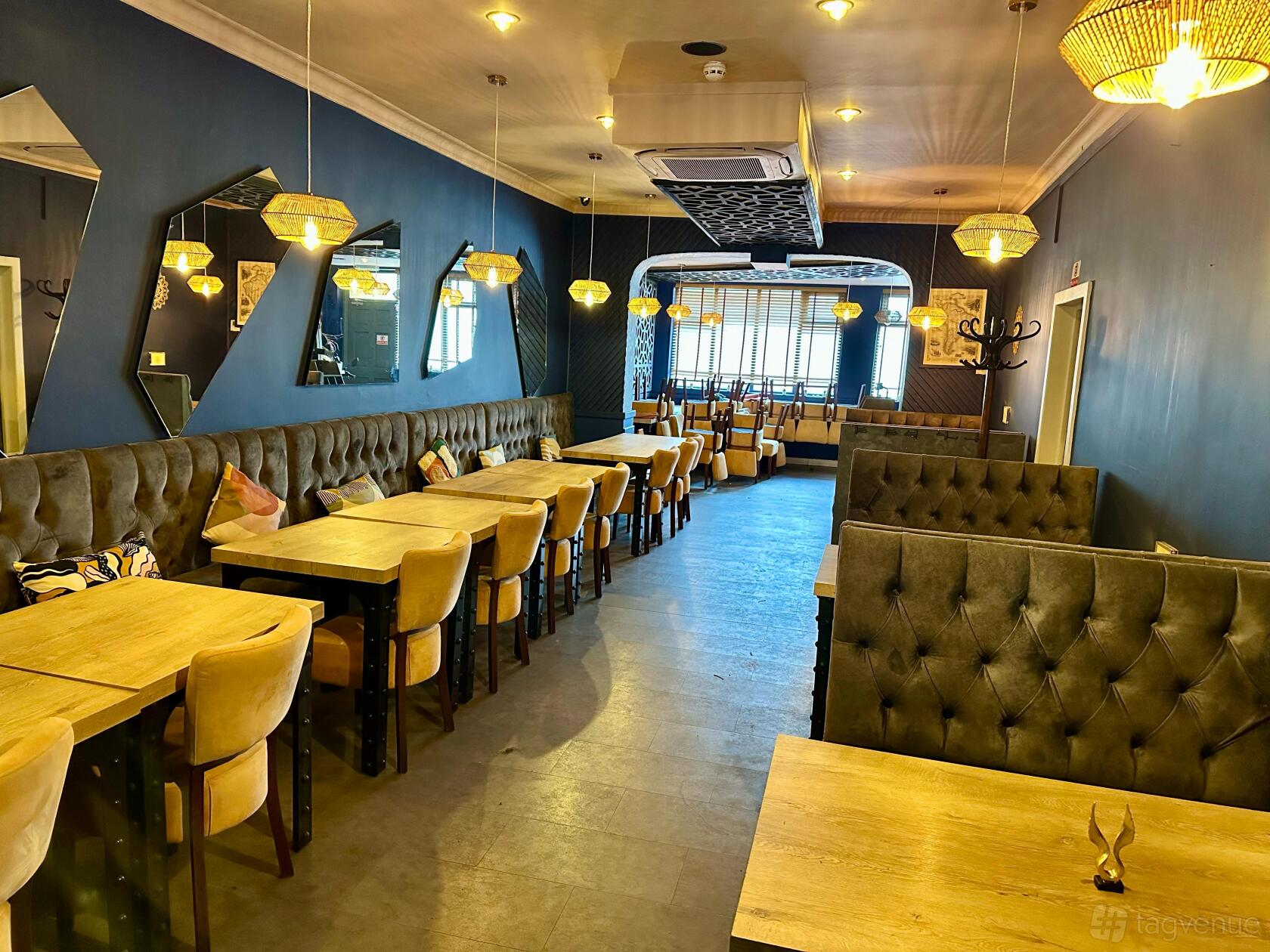 The venue features a modern, stylish interior with warm evening lighting and natural daylight. Exclusive hire is available for private events.