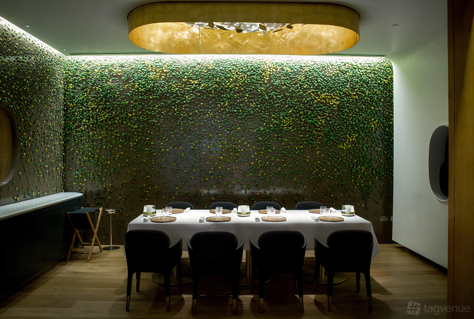 Salon Privé is a cozy, private alcove in the heart of Mayfair, featuring dark lacquered walls with green silk buttons that reflect the greenery of nearby Hyde Park. A modern fireplace adds a warm, classic touch. The space accommodates up to 12 guests and its hire fee is £300.