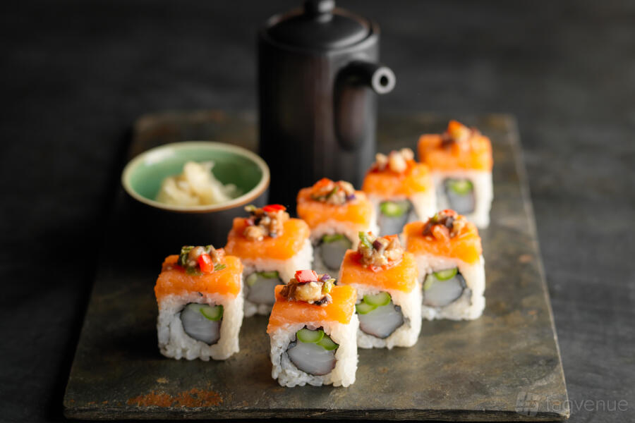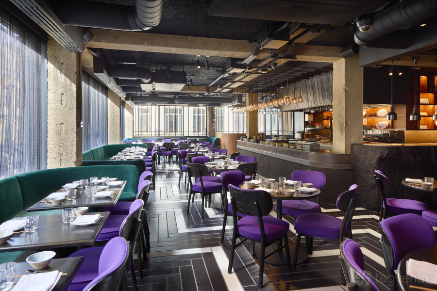 A spiral, burnt-timber staircase leads guests to the upper level which boasts an open Robata grill, sushi bar, and 155 -cover dining room. The exposed Robata grill accommodates up to 15 guests and serves smoky Japanese BBQ such as Miso-marinated chicken, Grilled Octopus, Spiced fillet of beef and seasonal vegetables straight from the grill to plate.