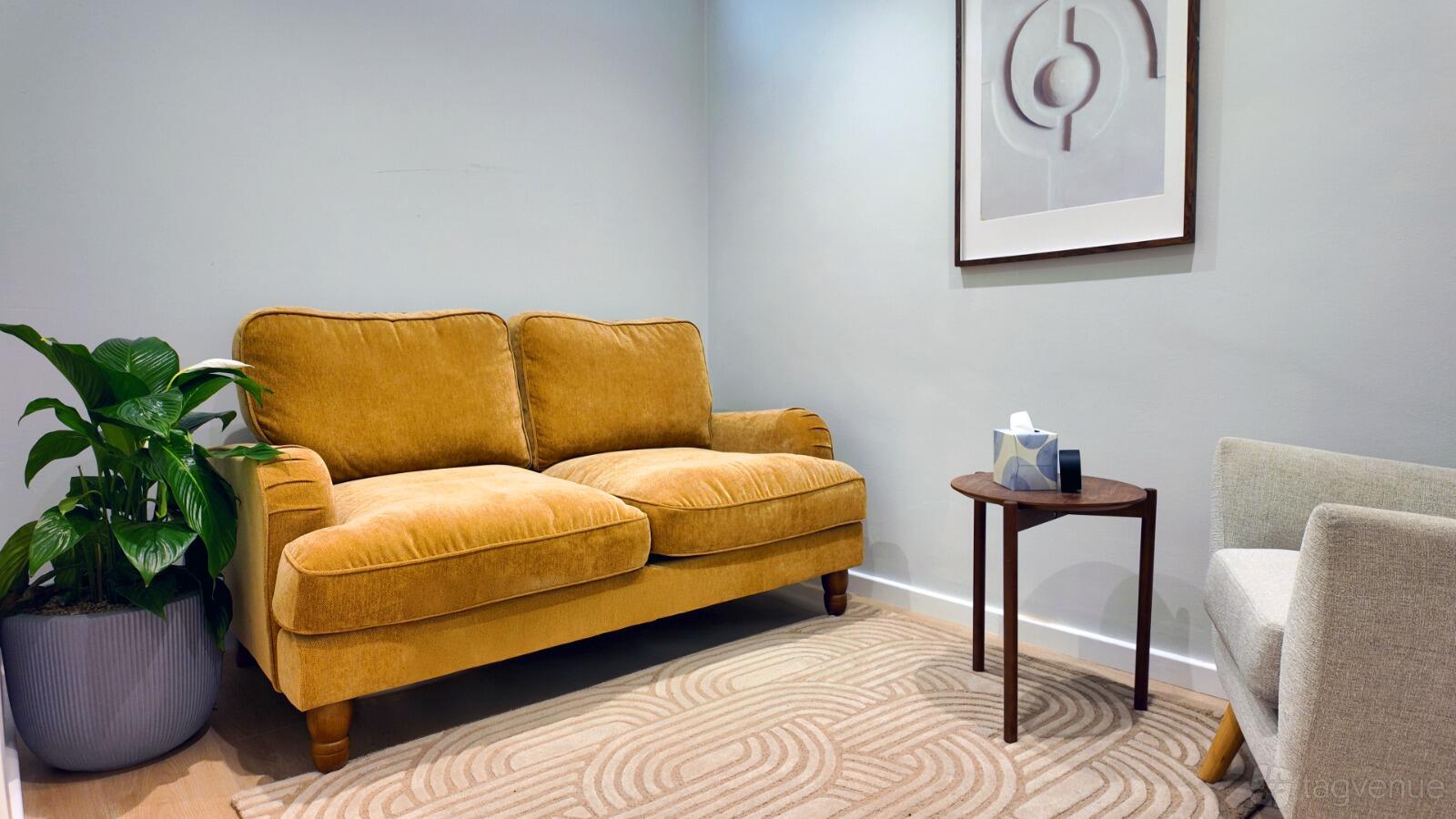 Furnished with a Dandelion-toned velvet sofa, a contemporary therapist's chair, and a sleek wooden side table, the room balances modern elegance with cosy charm. A textured rug and abstract artwork enhance its calming ambience.