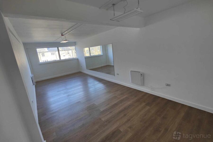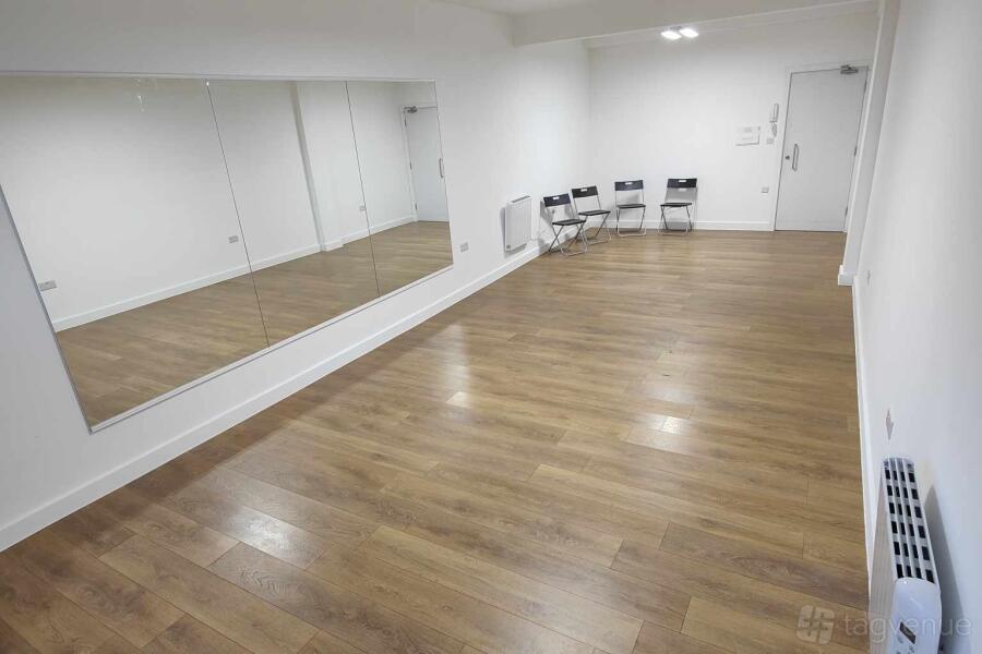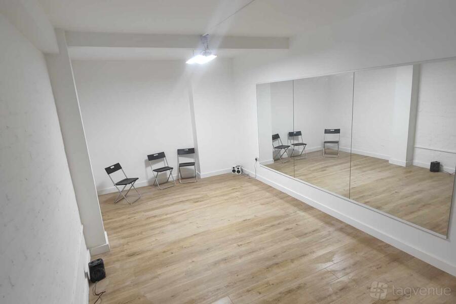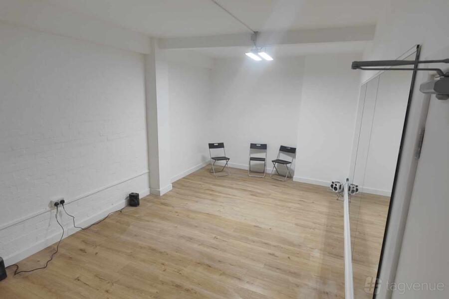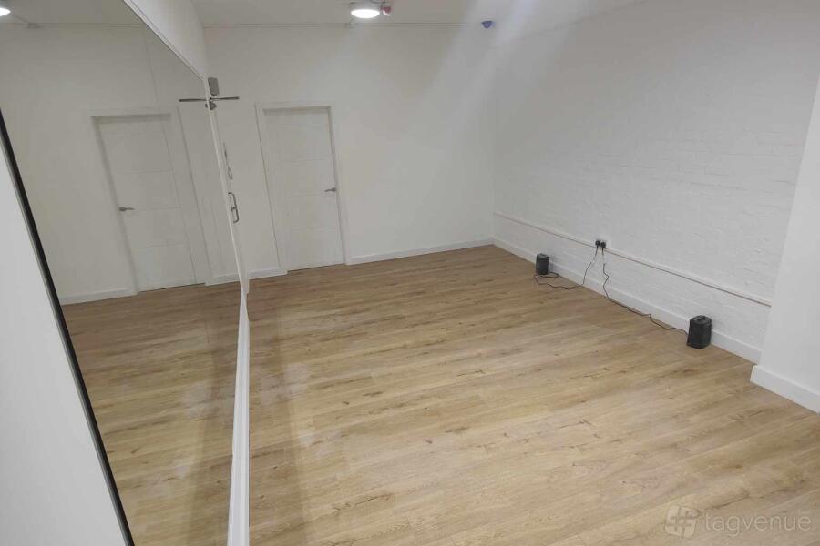 This dance studio in Dalston offers a bright and spacious environment, perfect for classes, rehearsals, and private training. The space features large wall mirrors, a high-quality wooden laminate floor, and a professional sound system, creating an ideal setting for dancers of all levels.