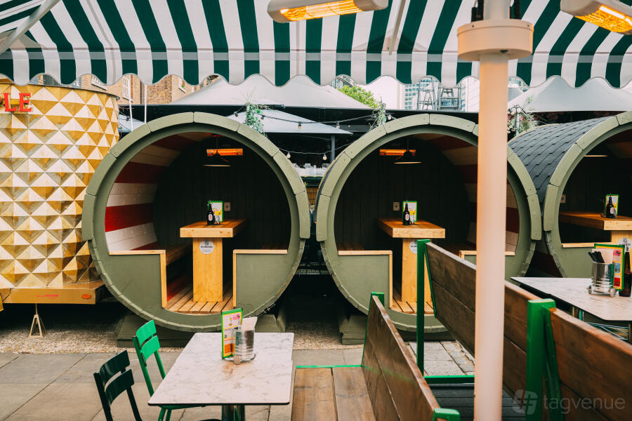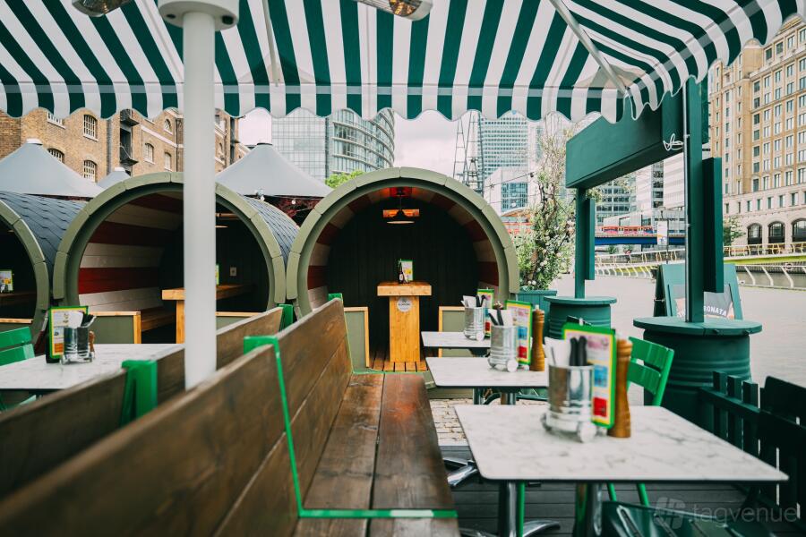 Looking for the perfect venue to host your next unforgettable event? Look no further! Our Sunny Quayside Terrace offers breathtaking views of the iconic Canary Wharf skyline—ideal for a summer party! The terrace, which can accommodate up to 150 guests, is partially covered and heated, ensuring guests stay comfortable regardless of the weather. The space is furnished with a mix of table and barrel seating, creating a casual yet chic vibe. To keep the drinks flowing, our Pineapple Bar serves refreshing Aperol and Pineapple Margherita slushies that are sure to keep the energy high.