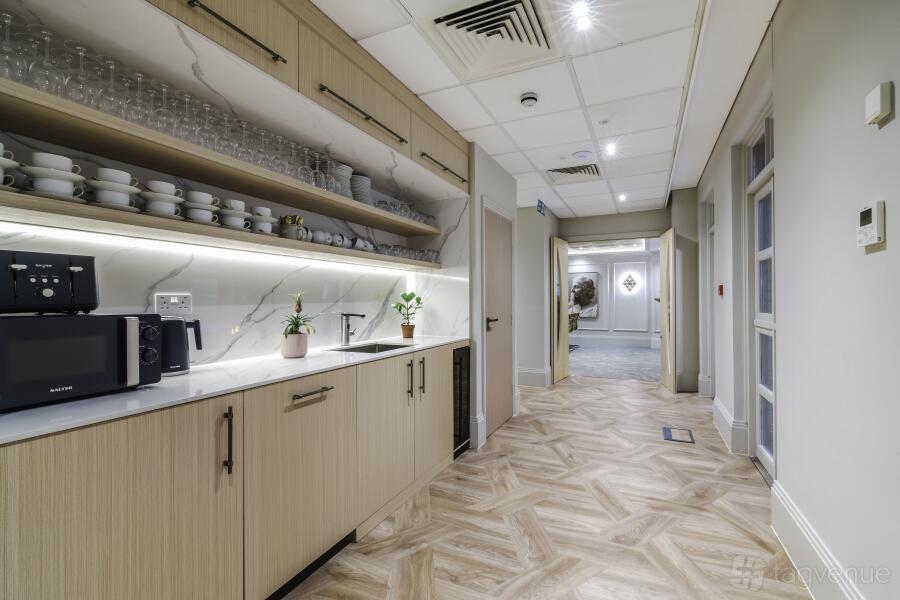 This sleek and modern venue, under a year old, offers approximately 861 square feet of fully serviced space for events and networking. Guests will have access to a kitchenette and a comfortable salon area with two large chairs. Tea and coffee come with the package, but we’ll happily put you in touch with catering services.