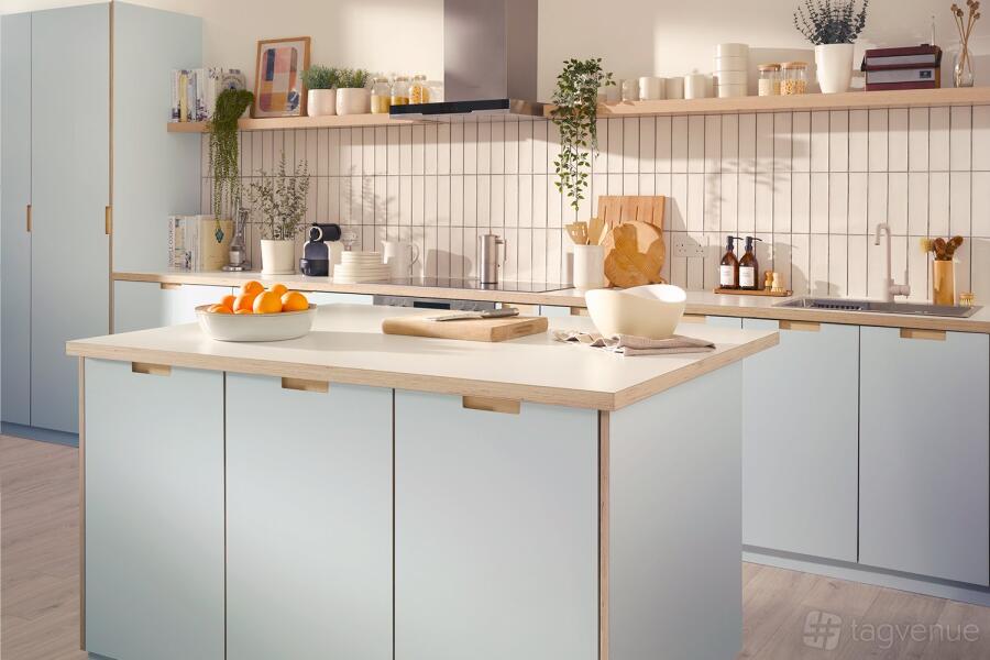 A bright, spacious kitchen studio in London for photo and video shoots. Designed with a modern aesthetic, it features pastel cabinetry with wooden accents.