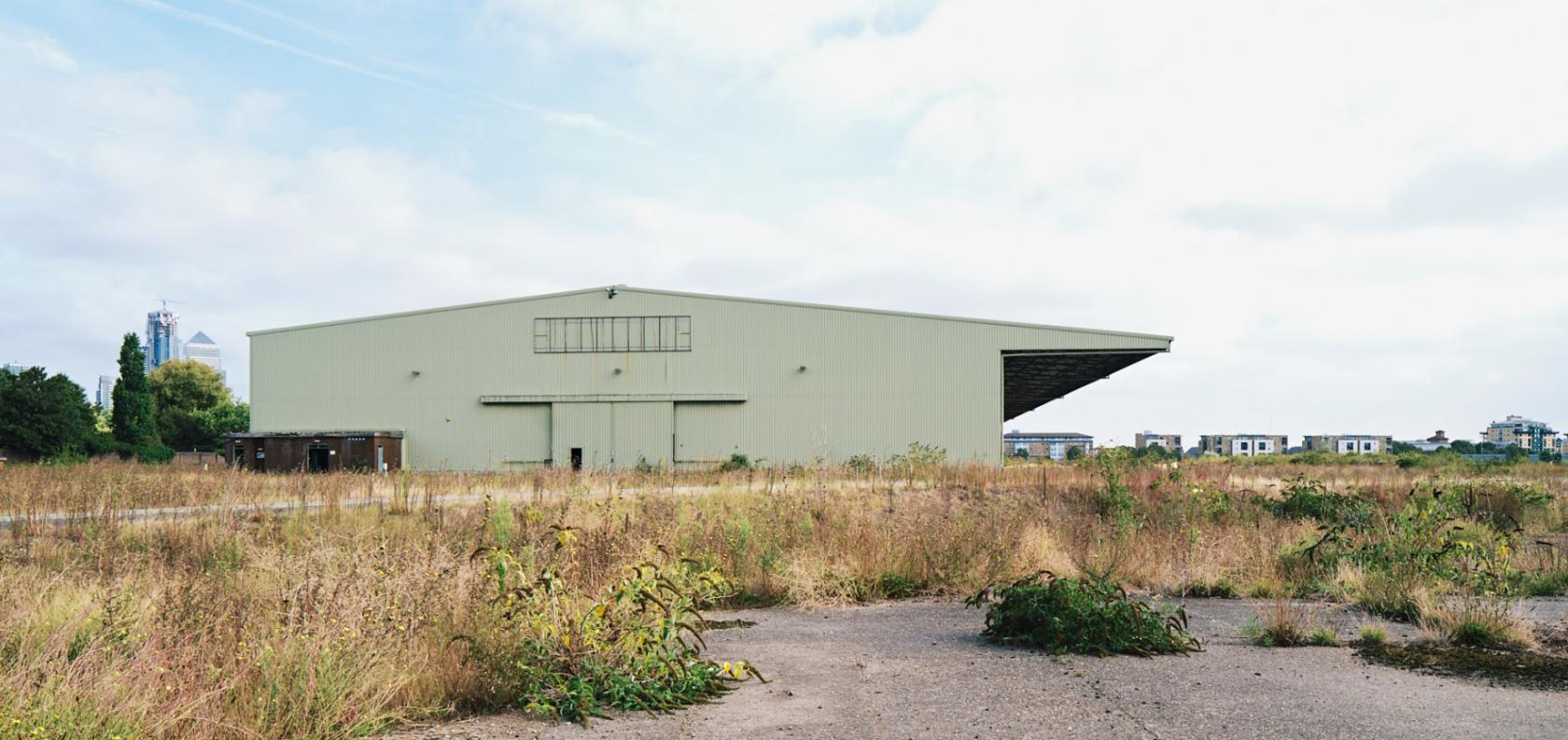 Outside, 12,000 sqm of raw landscape surrounds the warehouse, combining greenery, hard standing, and wild foliage with views of Canary Wharf. This outdoor area can be hired separately for unit bases, location shoots, or large-format activations.