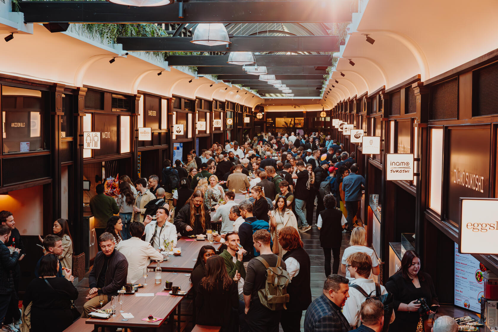 The structure of the arcade naturally dictated the arrangement of 14 kitchens and two beer halls, with communal seating flowing beneath the spectacular glazed roof.