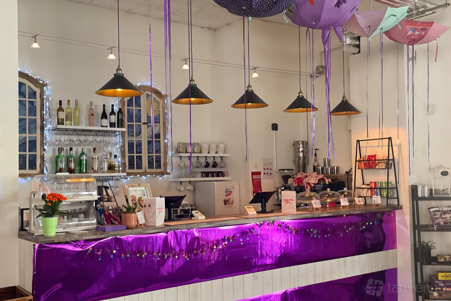 Our main area features a café, bar, and an event space with a stage and mic/amp setup, accommodating 60-100 people. Just perfect for meetings, presentations, parties, or even a sip-and-paint event with our sister company, PopUp Painting. We also have a private room at the back for 20/30 people seeking a more intimate setting.