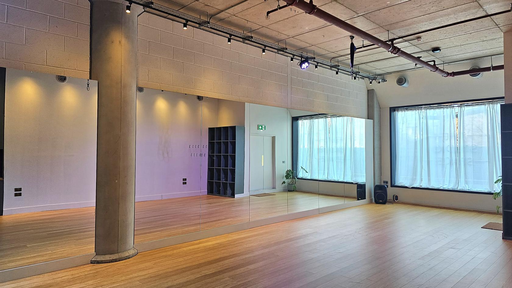 We have two beautiful studios featuring wooden floors, full-length mirrors, high ceilings, large windows, aerial rigging, and variable lighting—both fully accessible on the ground floor.