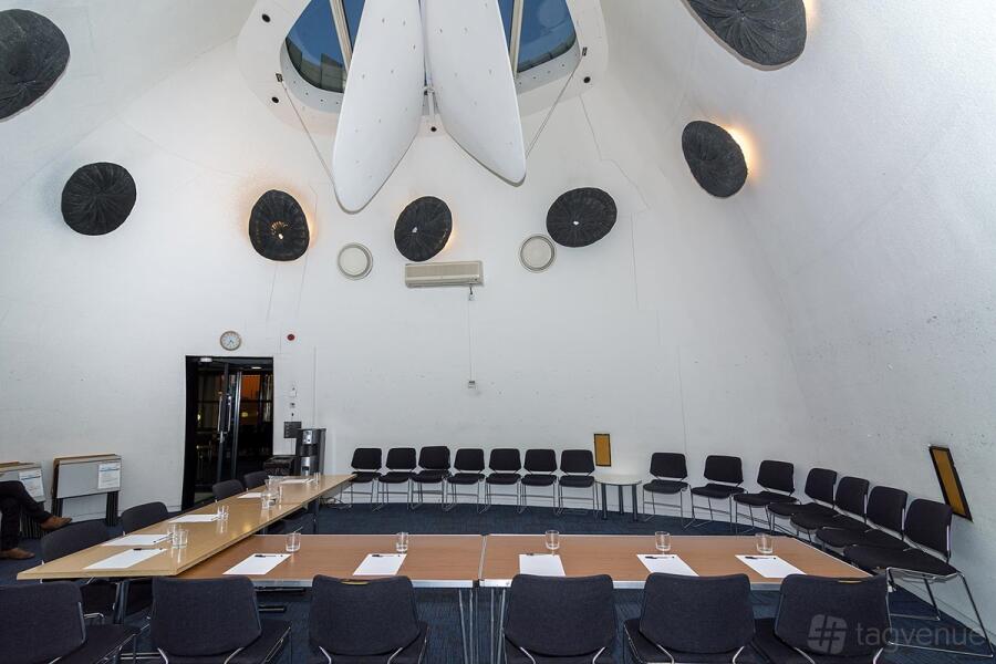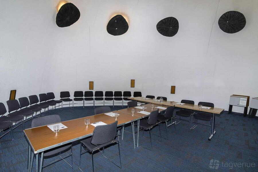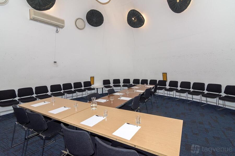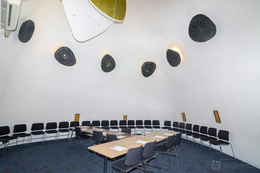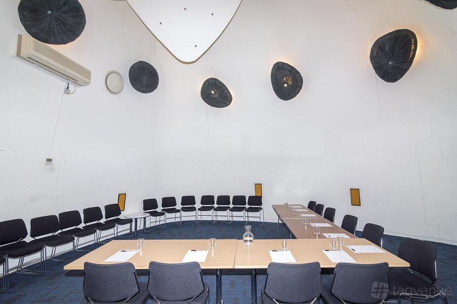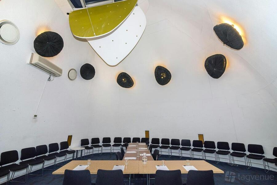 The venue offers two unique “pod” rooms. Pod 1 is a creative area that has curved walls and high ceilings. Pod 2 includes a raised stage and wet play area, ideal for children’s events. The outside foyer serves as a breakout area for longer meetings.