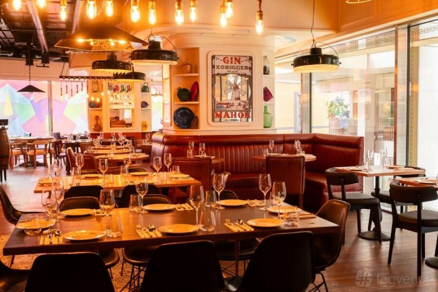 The open kitchen, led by Executive Chef Nacho del Campo, adds theatre to the dining experience. Signature dishes include Arroz Negro and Galician-Asturian Rib-eye Cazurra beef. The drinks menu features unique drinks and an extensive Spanish wine list.