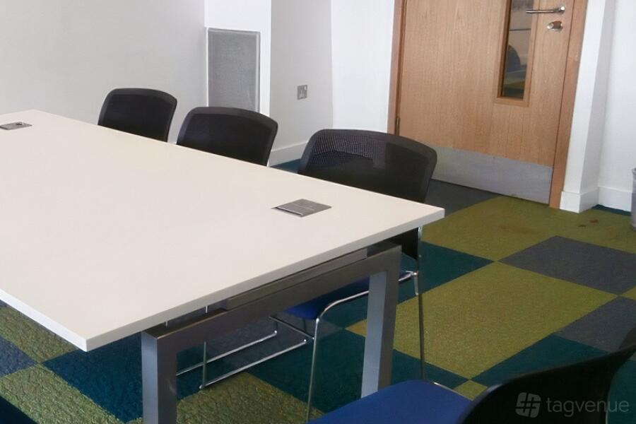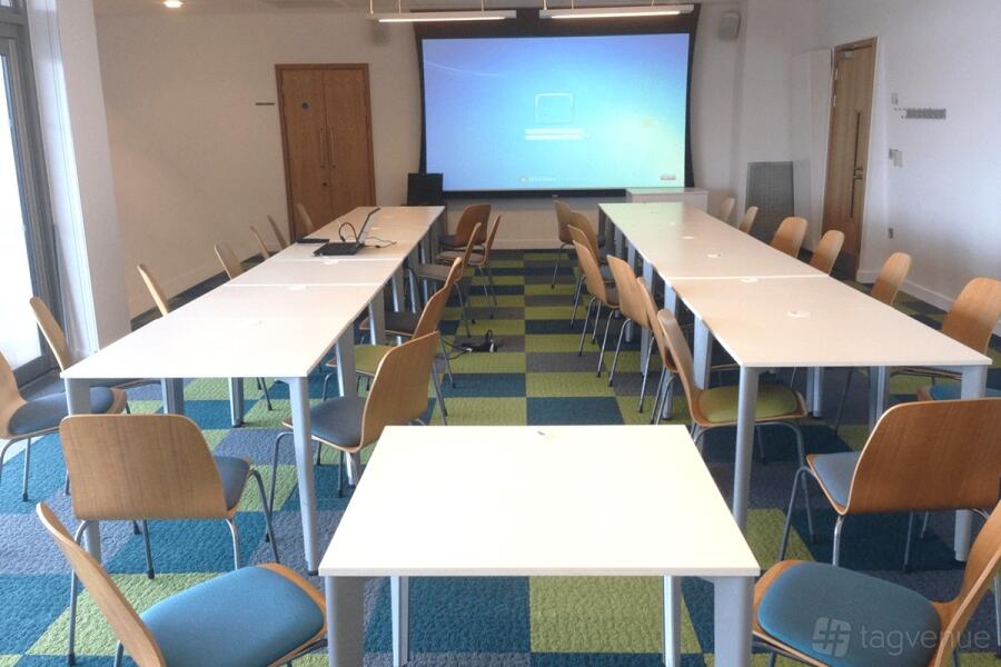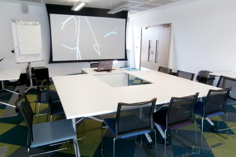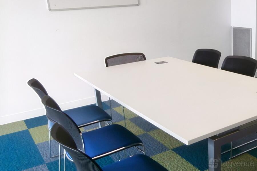 Meeting Room 2 offers a spacious environment for meetings, conferences, and presentations. The room includes tables and chairs and a projector. It supports multiple professional settings.