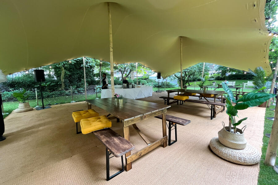 Stretch Tent, including seating and décor. The stretch tent will provide shade and shelter to cover all eventualities of British Summer weather. It will be decorated with lights and bunting.