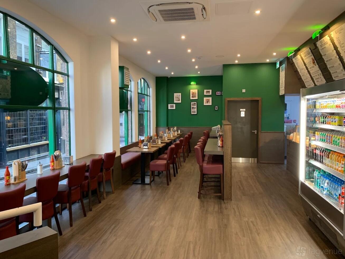 This space is ideal for a casual and comfortable experience with South American food. We offer 30 seats. With large windows and deep green walls, it feels open and inviting.