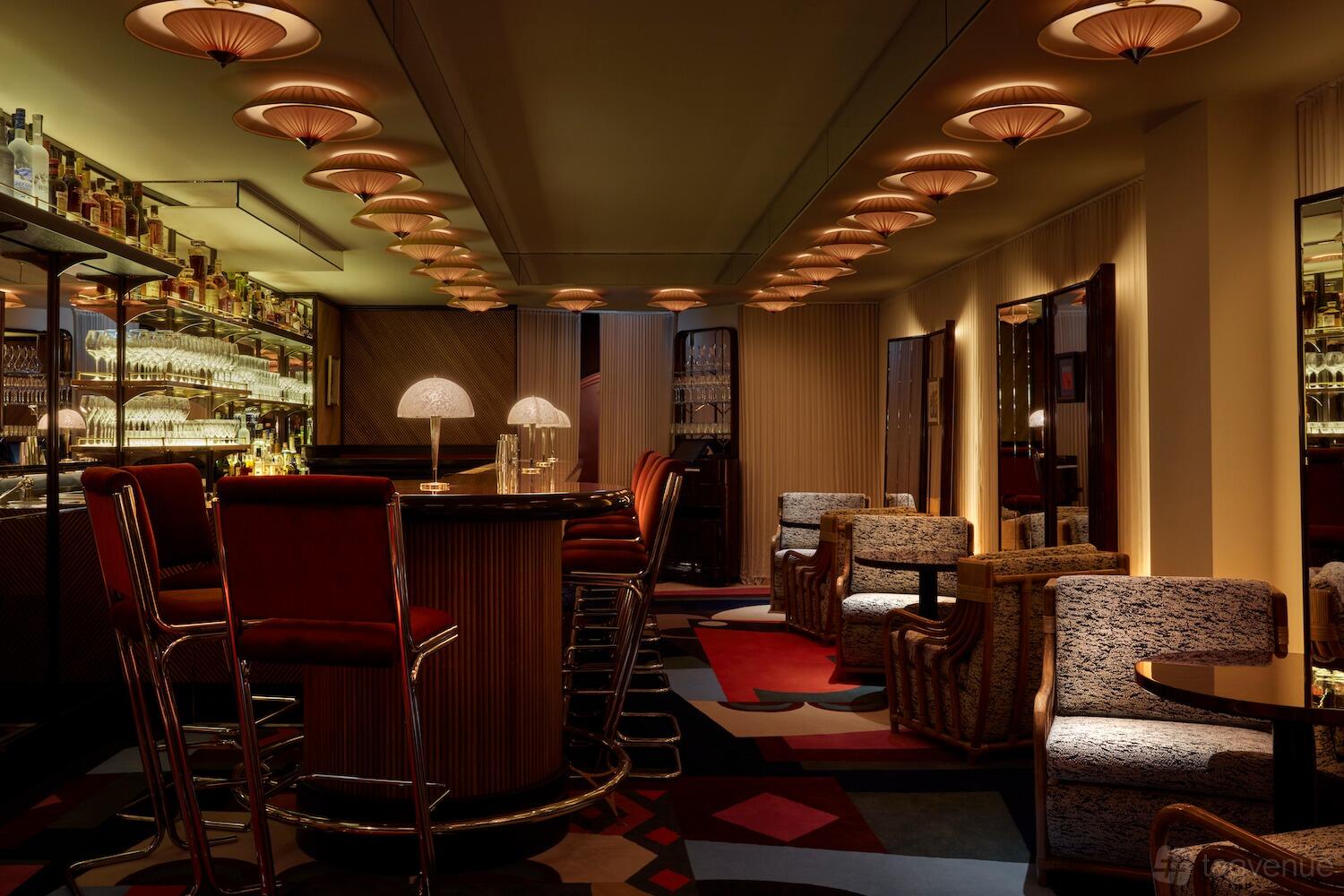 The Lounge at Bar des Prés offers a cozy and sophisticated setting beneath the main restaurant. It is excellent for private events with up to 50 standing guests. The space includes a bar, DJ decks, and plush seats arranged in intimate configurations.