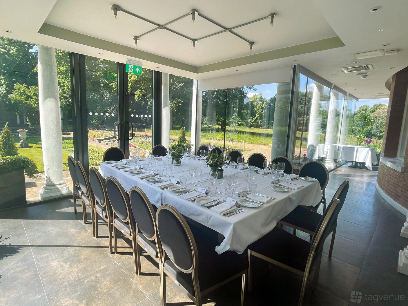 Private room with glass walls and a beautiful view of the Sunken Gardens. Perfect for a private dinning event, small wedding celebration or meeting.