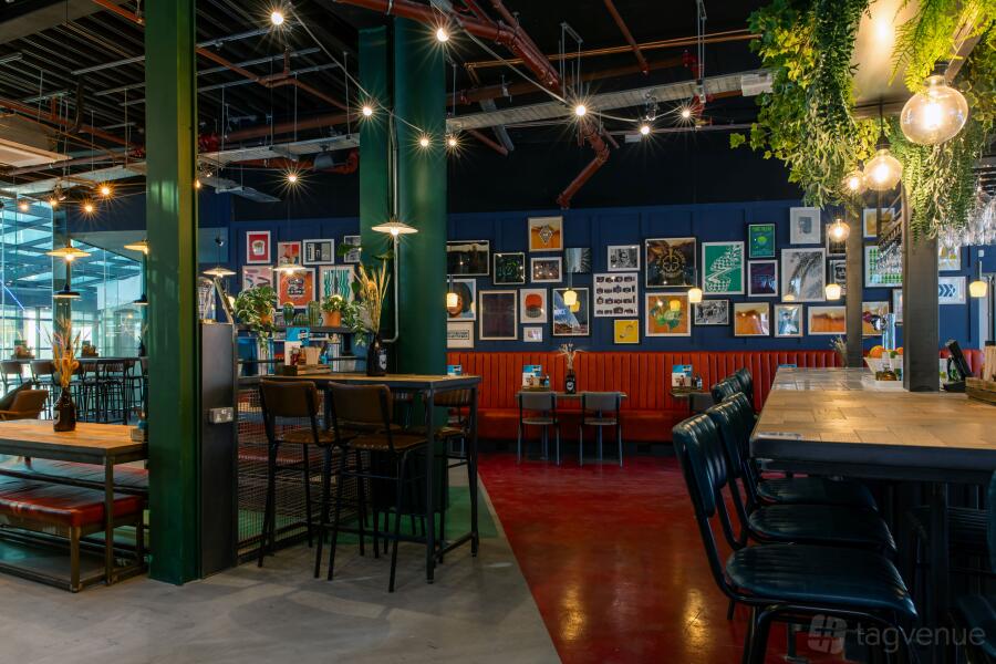 The space features a variety of seating options, a full bar with 29 taps serving up a wide range of craft beers and drinks, and a TV screen is available for presentations or to catch the big game.
