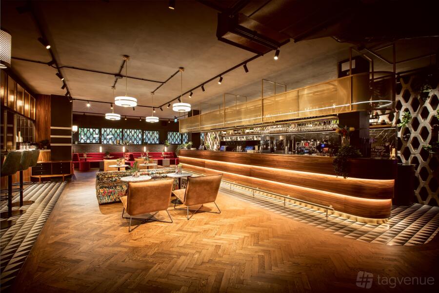 This concrete block design of the former car park has been re-created within the back bar where it forms a decorative back drop as well as practical drinks display. The concrete finish is offset against rich timber and brass panelling, plush velvet seating, polished timber floor and modern marble tiling.