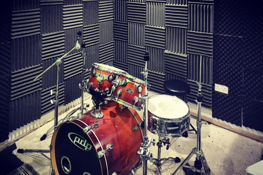 The space is large enough for 7-8 people to rehearse comfortably and it is ideal for live recordings as the corner has a drum booth to help isolate and reduce bleed from other instruments. The room has a mic box, which connects to the control room mixing desk for recording purposes. Full CCTV is in operation.