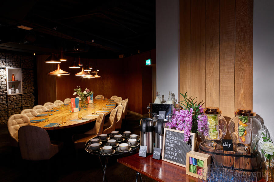 Set within the historic Corn Exchange, the Main Restaurant at Banyan offers a spacious, light-filled setting that balances character with a modern layout.