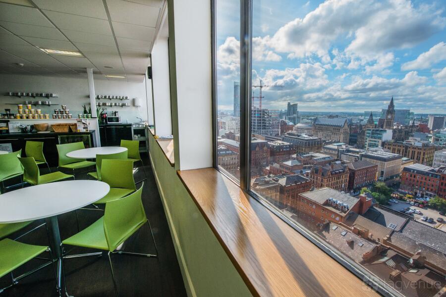 The room is equipped with air-conditioning, modern equipment, and a great view of Manchester.