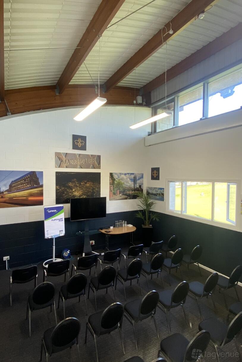 Looking for the perfect space for your next important meeting or team-building event? Look no further than our versatile Function Room at Trafford Golf Centre. With a capacity to accommodate up to 28 guests, this spacious room offers a variety of seating layouts to suit your needs. The room boasts carpeted floors, allowing for a comfortable and professional atmosphere, while the large windows flood the space with natural light, creating a bright and inviting ambiance. The white walls, adorned with artwork and photographs, add a touch of elegance to the room.