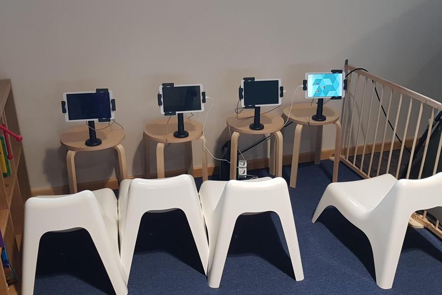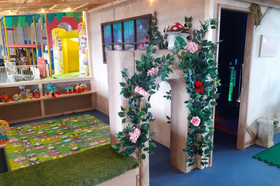 It's a unique play space filled with fake greenery and toys designed to inspire creativity in children. There's a colorful table surrounded by chairs where kids can gather to play and create together!