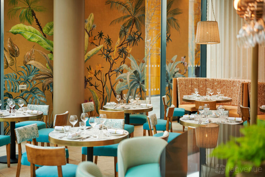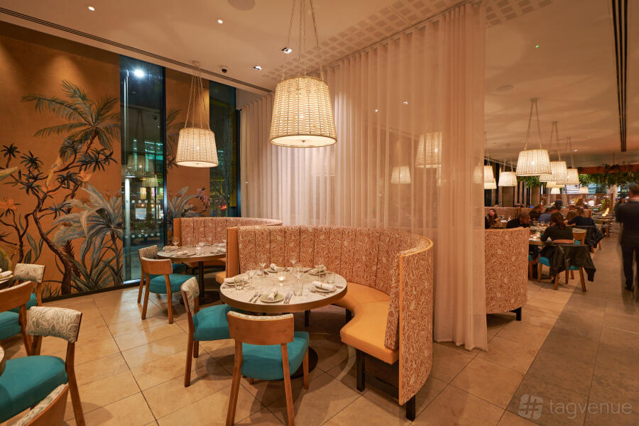From here the beautiful restaurant and bar lounge unfolds with vast ceiling-to-floor windows flooding the venue with natural light and affording views out to the First Street district and beyond.