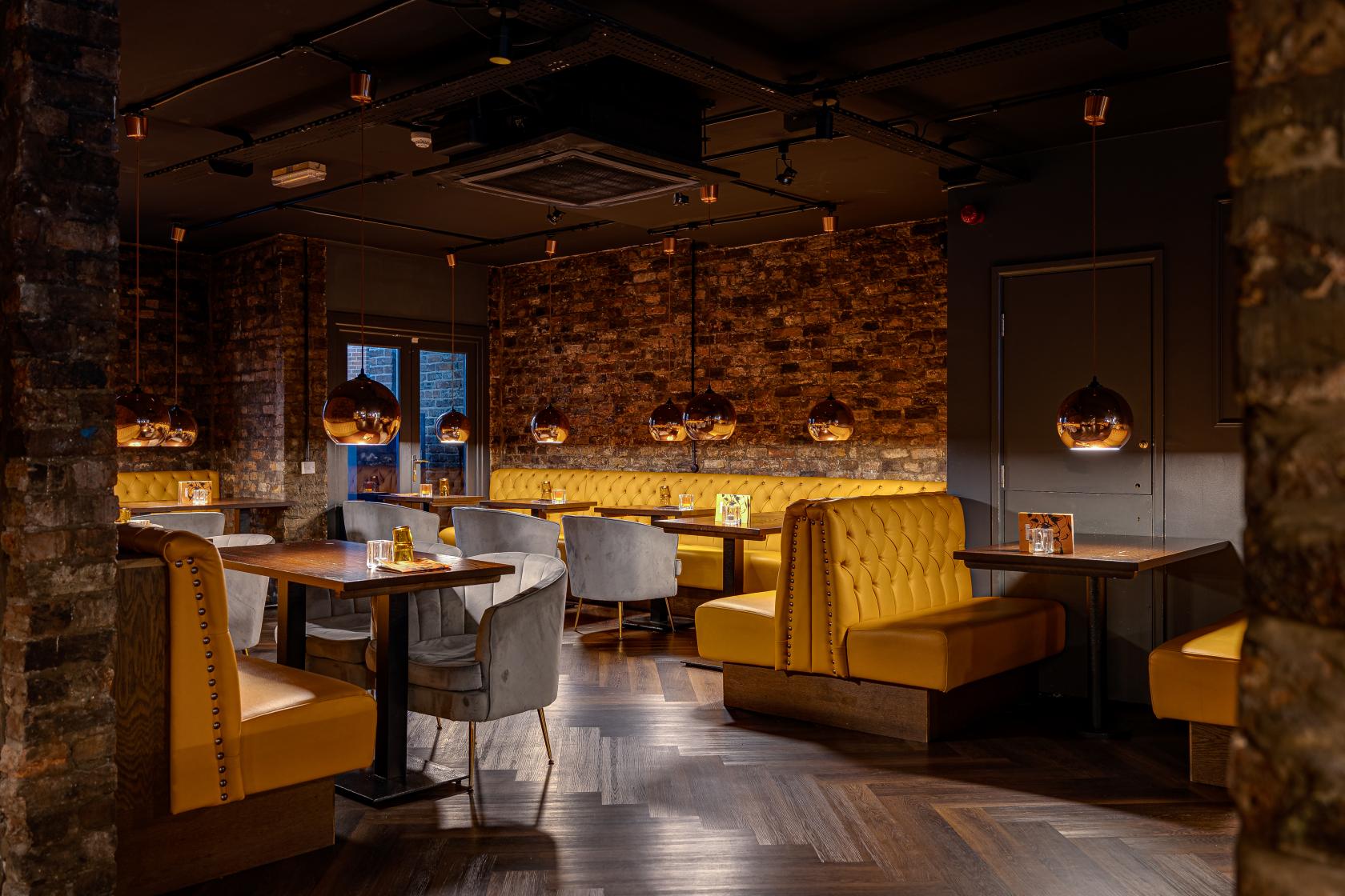The 1st-floor area features a central cocktail bar and luxury leather booth seating for 120 people, with tables for 4 to 8 guests.