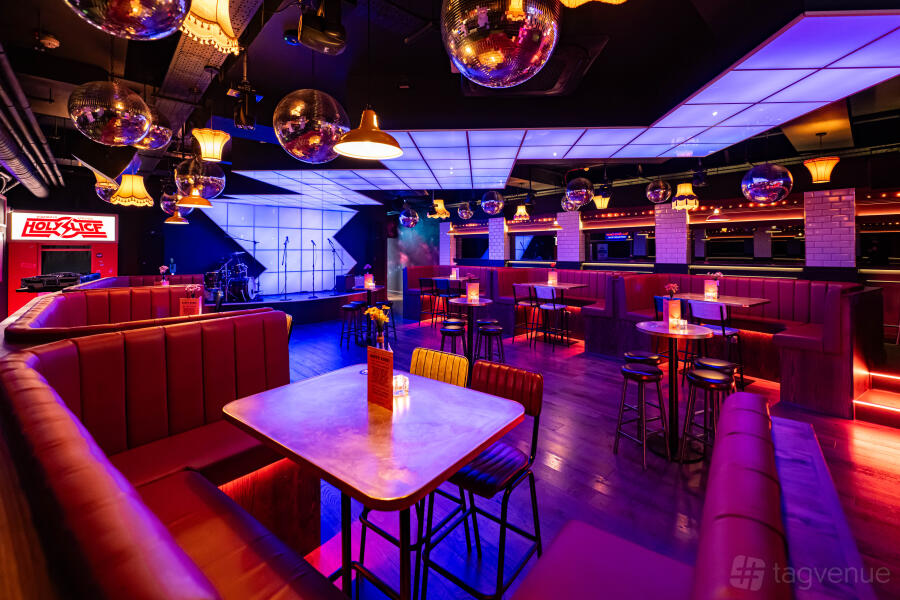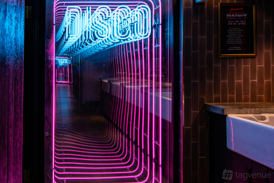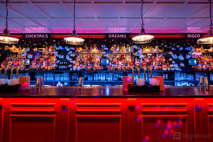 The bar has private bars, 2 DJ booths, small front private section, VIP tables and a dance floor surrounded by Waltzer styled seating booths and blaring neon lights.