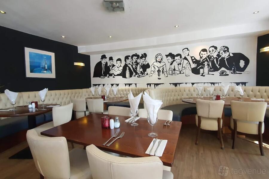 This restaurant offers a stylish setting for up to 100 guests. It includes a bar area and lots of dining space. The arrangement flows naturally between open dining zones and more intimate booth seating.