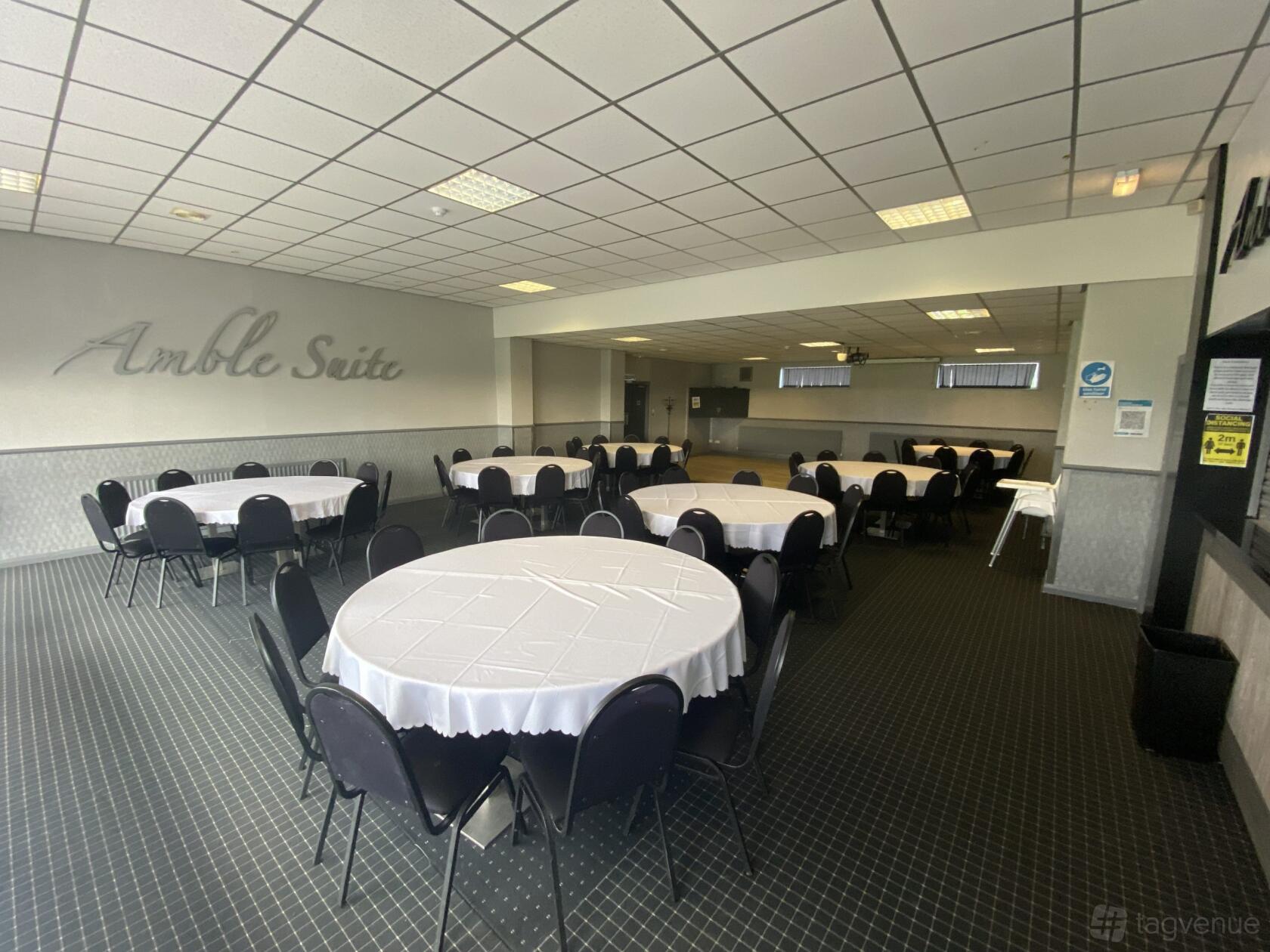 The room measures 8.2 meters by 14.8 meters. It can seat 80 people with a standard setup. There are 23 square tables available, and the room can fit 7 round tables. Guests have access to a rear patio. You can upgrade to round tables in the Amble Suite for an additional £10 per table and cloth.