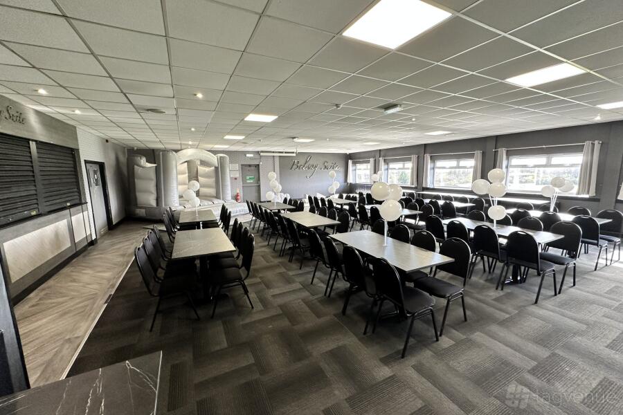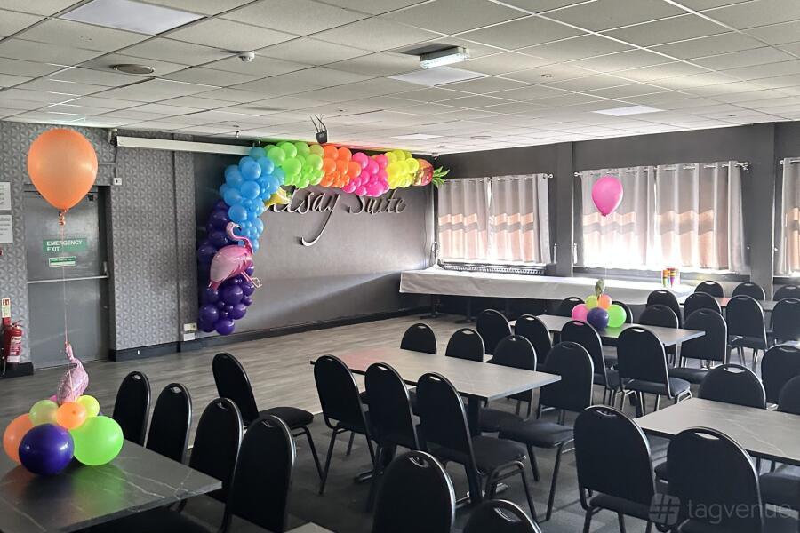 A Bluetooth speaker is available for hire, and there is a microphone and projection facilities provided. Photos are available to show the standard room setup. Additionally, a bouncy castle and soft play equipment can be set up in this room.