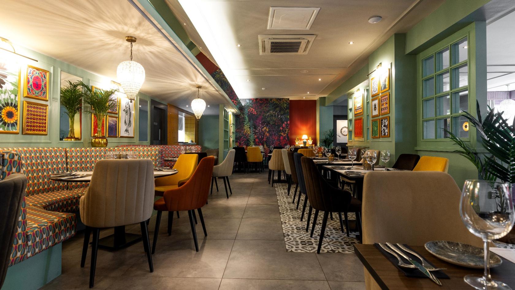 The main dining room at Chakh Doom can host up to 90 guests. The interior is colorful, with different patterns and shapes creating an atmosphere. Couches, tables and chairs are available. This space will be a fit for family functions, corporate receptions, or dining parties.