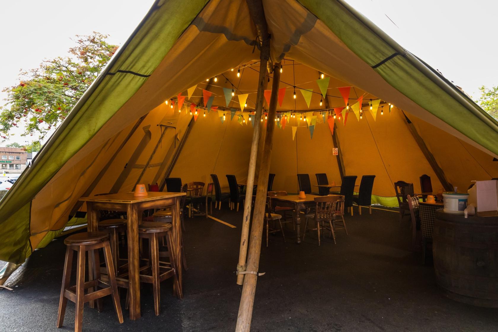 The Tipi Buffet is an outdoor space at the Blackbird Inn. It can accommodate 65 guests. Under the tent, there are tables and chairs. It's a great space for celebrations, and family gatherings!