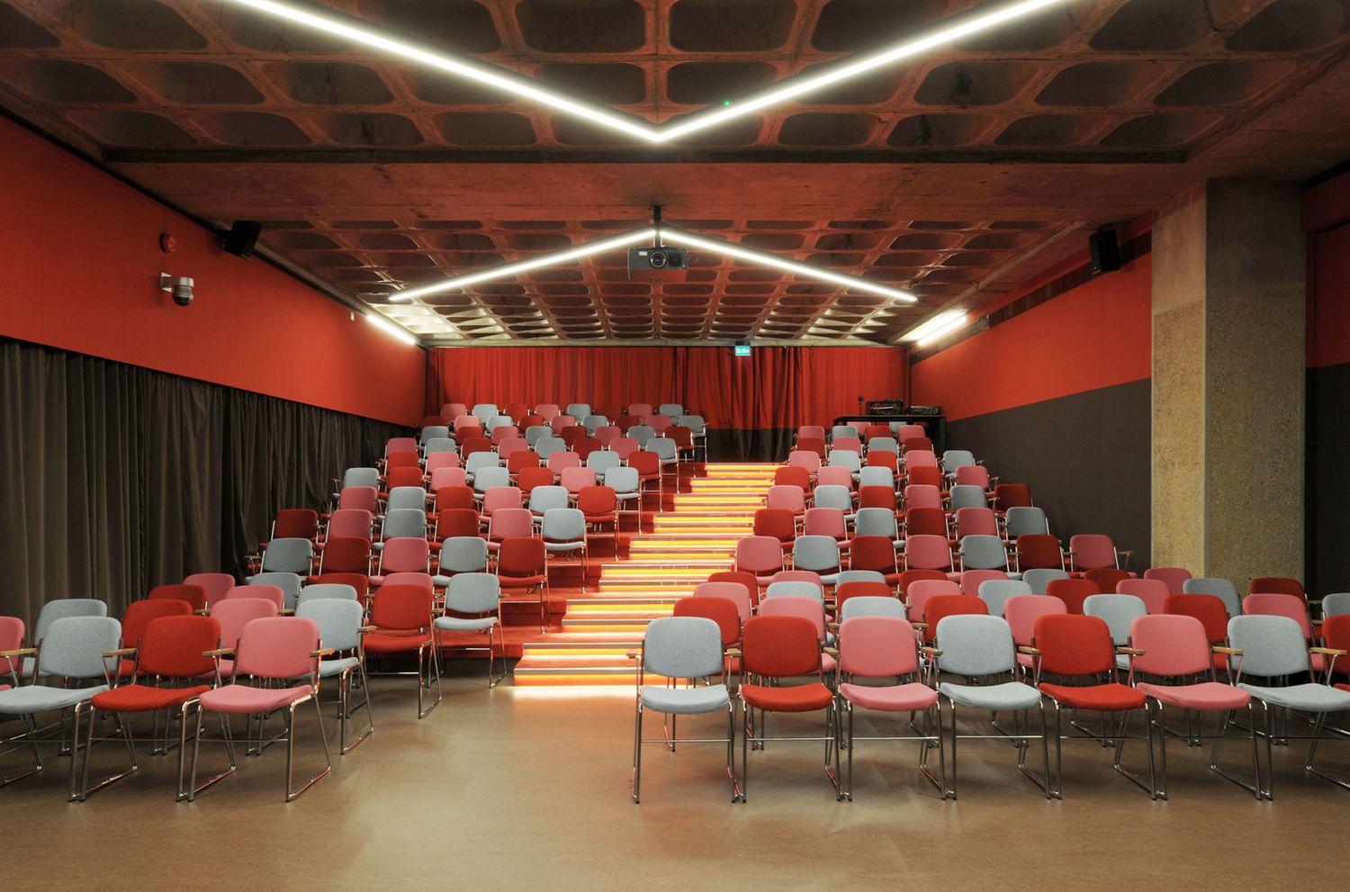 This auditorium on the first floor can welcome up to 150 guests. It’s ideal for lectures and screenings. The space includes a 5-metre screen, a projector, mics, and audio recording equipment. You will also have access to the lounge area for breaks and networking moments.